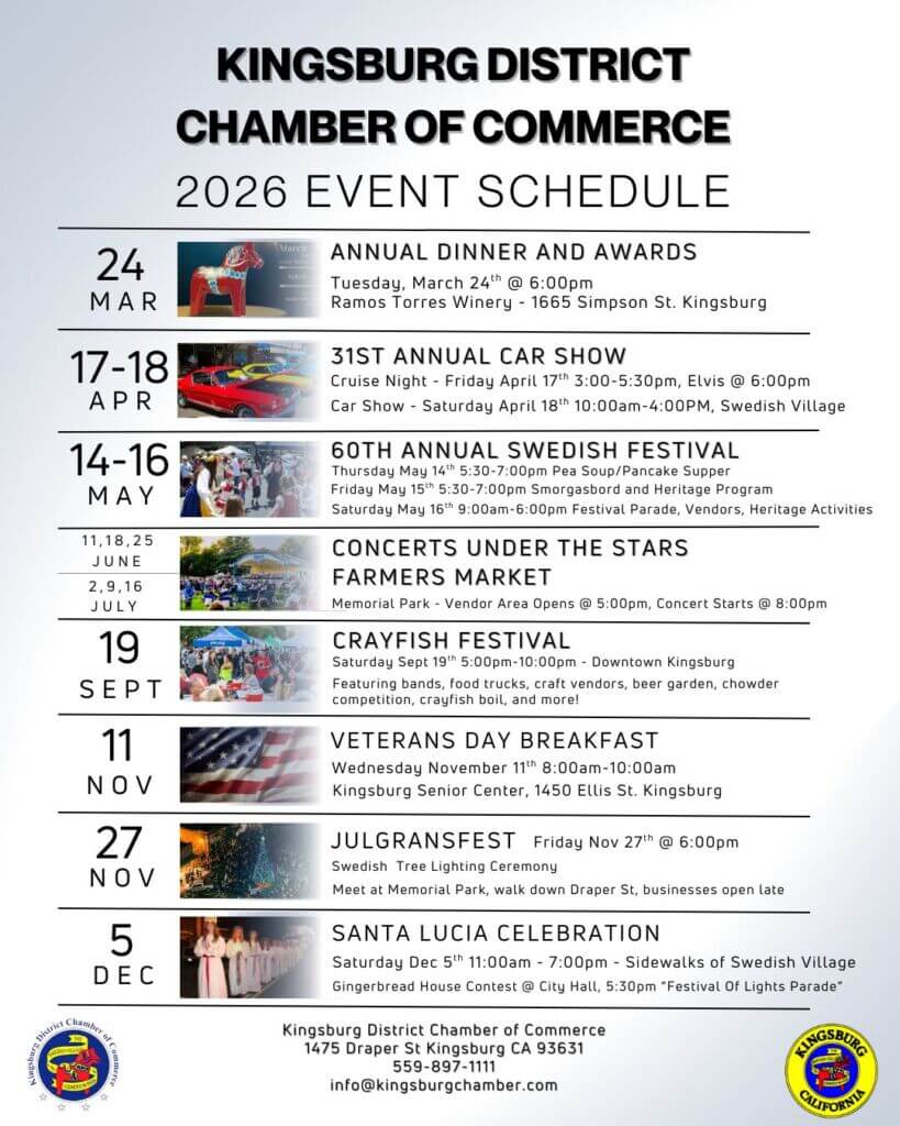 The Kingsburg District Chamber of Commerce is the leading organization dedicated to serving Kingsburg, regional businesses and community prosperity through advocacy, access to leaders, economic development, connectivity, and business education.