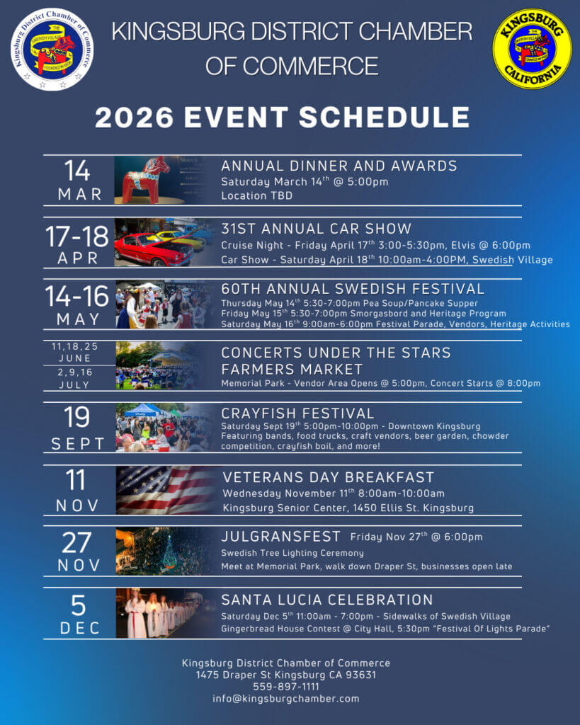 The Kingsburg Chamber has many events throughout the year. Check out the calendar below for what's coming up.